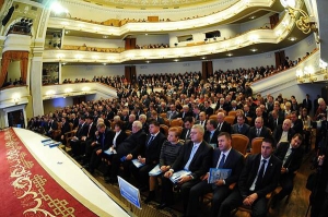 Из черного "лексуса" выходит Николай Азаров. С ним - три охранника. Садится в президиуме с руководителем Донецкой областной организации Партии регионов, нардепом Борисом Колесниковым и губернатором Андреем Шишацким. Свое выступление с трибуны Азаров начинает критикой оппозиции:
