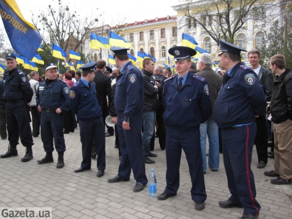 Зал суда окружили "регионалы" с национальными флагами. Возле них стоят милиционеры. В толпе слышно, что то представители Партии регионов. Сами говорят, что они харьковчане, сгоняют митингующих с газонов.