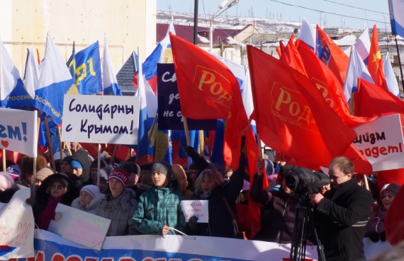 На митинг в поддержку жителей Украины и Крыма, который состоялся сегодня, 15 марта, в российском Магадане, не смотря на сильные морозы, вышло более 5 тысяч человек.