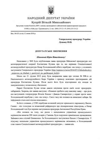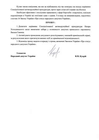 Направил свое депутатское обращение генпрокурору Юрию Луценко с требованием допросить Назара Холодницкого о вымогательстве взятки у Василия Ганыша. Также прошу активизировать проведение досудебного расследования по данному уголовному делу, по результатам которого привлечь виновных лиц к уголовной ответственности ".