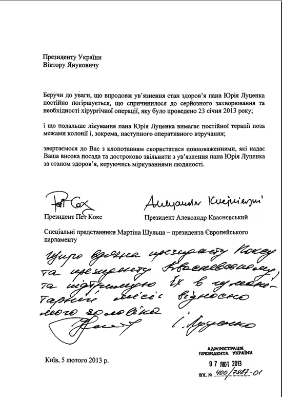 Как свидетельствует документ, попавший в руки редакции "Сегодня", еще в феврале посланники Европарламента Пэт Кокс и Александр Квасьневский написали президенту Украины Виктору Януковичу прошение о помиловании Юрии Луценко.
