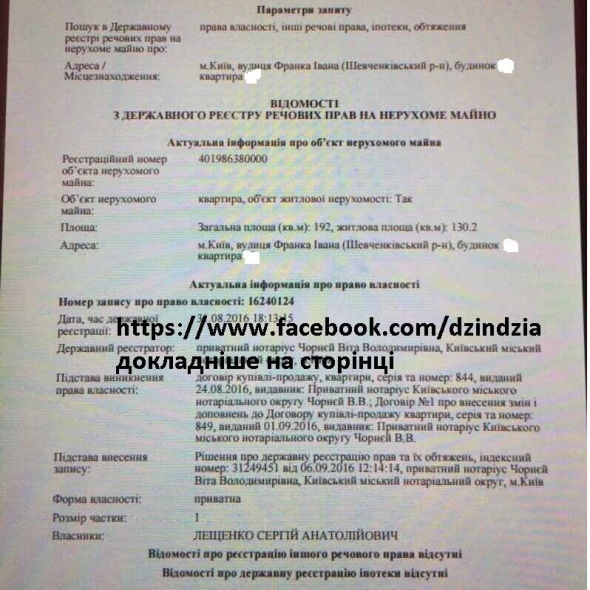 В своей последней декларации народный депутат Лещенко не указал финансовые средства, достаточные для приобретения данной недвижимости, соответственно, средства, потраченные на это действие, он заработал в период с 1 января 2016 года. Согласно публичным заявлениям Лещенко коммерческой деятельностью он не занимается и получает доход исключительно от политической, журналистской, общественной и педагогической.