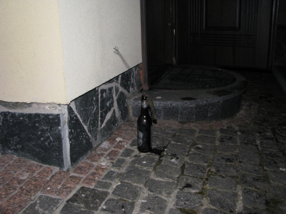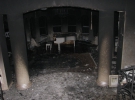 Внутри здания царит полный беспорядок. На полу мокро от тушения пожара. Во многих комнатах почерневшие стены, обожженные мебель и пол. Кое-где остатки от разбитых бутылок. Остались даже целые бутылки с зажигательной смесью — очевидно, что нападавшие использовали "коктейли Молотова".
