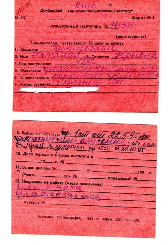 Так, она училась здесь с 1992 по 1995 год, но была отчислена 20 октября 1995г., как таковая, что не приступила к занятиям. Далее, через два года, 22.10.1997р. она восстанавливается на учебе, а через полтора месяца, 4.12.1997р., - отчислена за неуплату. Об этом свидетельствует справочная карточка Донбасского горно-металлургического института", - написал он.