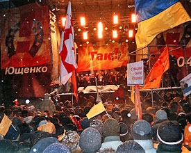 Активистов Оранжевой революции пытаются различными способами "выдавить" с Майдана: позади сцены включили вентиляцию из метро, и на ведущих митинга дует холодным воздухом вместе с мусором.
