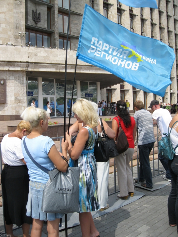 На площади перед зданием облгосадминистрации собралось больше тысячи активистов Партии регионов. Под доносящиеся из крупных динамиков русские народные песни участники акции прибывали на митинг организованно, отрядами из разных районов Донецка и избирательных округов. Каждая группа имела своего руководителя, который отвечал за транспорт и наглядную агитацию.