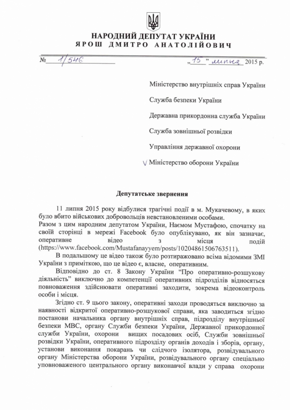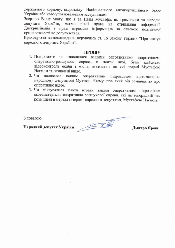 Лидер "Правого сектора" Дмитрий Ярош обратился в МВД и СБУ с просьбой разобраться, откуда народный депутат Мустафа Найем (БПП) получил оперативное видео событий в Мукачево, которое он опубликовал в своем Facebook.
