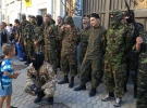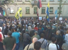 Среди митингующих - женщины и активисты "Правого сектора", ребята в военной форме и масках.