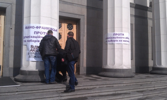 У центрального входа в здание собралось около 200 человек. Они держат плакаты "Отмена акцизного налога на переоборудование - создание рабочих мест", "Авто не роскошь!", "Налогами на ввоз авто вы финансируете бюджет оккупанта", "Акциз" перечеркнутый двумя красными линиями, а также национальные флаги Украины. Некоторые плакаты наклеили на колонны здания парламента. Собравшиеся скандируют "утилизация".