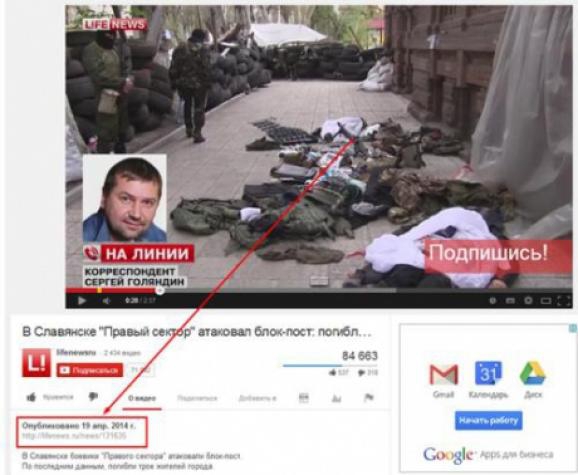 Российский телеканал Lifenews, который освещает события на Востоке Украины с позиции лояльности к сепаратистов, загрузил видеосюжет о стрельбе в Славянске, которая произошла в ночь на 20 апреля, еще накануне - 19 апреля, пишет tsn.ua.