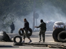 На видео видно, как вооруженные в масках люди контролируют въезд в город, который загорожен шинами авто.