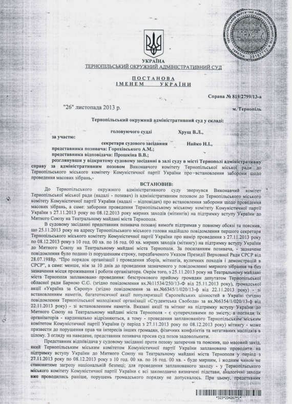 Тернопольский окружной административный суд запретил городскому комитету Компартии Украины проводить на Театральной площади в Тернополе митинг в поддержку Таможенного союза. Соответствующий иск о запрете этого собрания подала мэрия и выиграла процесс.