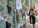 Девушки наклеили белье на клейкую ленту и развесили на витринах "Сбербанка России". Акция собрала несколько десятков прохожих, которые не понимали, почему белье вешают на окна банка. Месяц назад под этот банк принесли шины и овощи.
