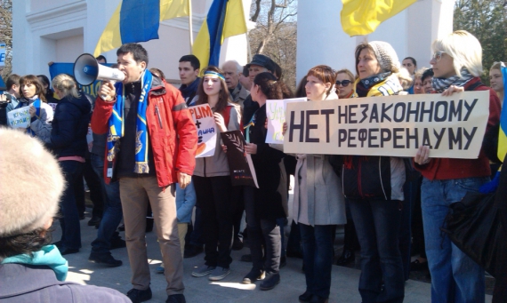 Активист крымского протестного движения Евгений Новицкий, местный правозащитник, во время акции сообщил две новости: ВР распустила парламент Крыма в связи с ее нелегитимностью и принятия ею незаконных решений. Вторая новость была в том, что в Москве проходит многотысячная акция протеста против военной аннексии Крыма.