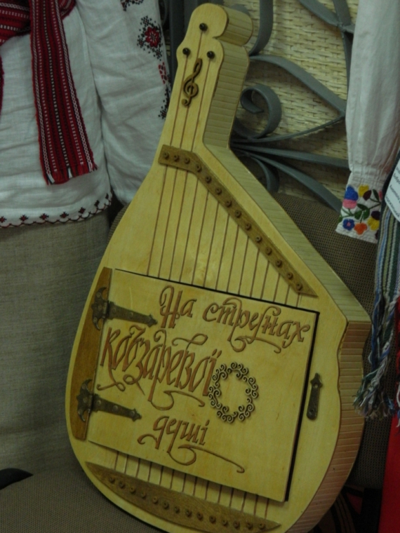 Играть на этом необычном музыкальном инструменте не сможет никто. Он не имеет настоящих струн, изготовлен из фанеры и бамбука. А вот заглянуть в его середину очень просто. В артбуке с размерами 64 на 41 см является не только стихи Шевченко, но и его вышитый портрет, портрет из кофейной гущи и еще много интересного.