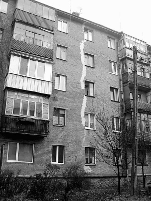 — Эта трещина проходит через пятый подъезд, — показывает на фасад жительница Екатерина Полуденная, 72 года. — Девушки с четвертого-пятого этажей собрали летом 300 гривен, наняли рабочих, они трещину замазали. Приходила комиссия из жэка и горсовета, посмотрели, поклеили маячки и ушли.