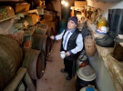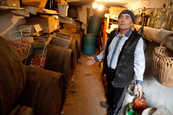 "Раньше все хозяева вино изготовляли тоннами, сейчас уже меньше, - говорит крупный мужчина с красным лицом. - Я делаю вино только для себя", - показывает одну бочку на 400 литров.