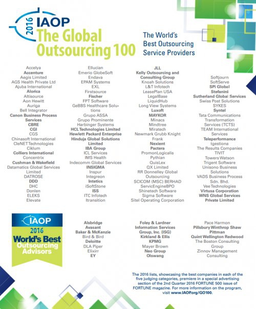 Global Outsourcing 100 – это ежегодный список лучших в мире поставщиков аутсорсинговых услуг. Компании попадают в рейтинг на основе заявок, в которых оцениваются прибыльность, рост команды, лучшие проекты, рекомендации заказчиков, уровень корпоративной социальной ответственности, а также инновации в схеме поставки услуг заказчику. Список составляется в помощь для компаний, которые хотят отдать услуги на аутсорсинг и ищут лучших и надежных партнеров для этого.