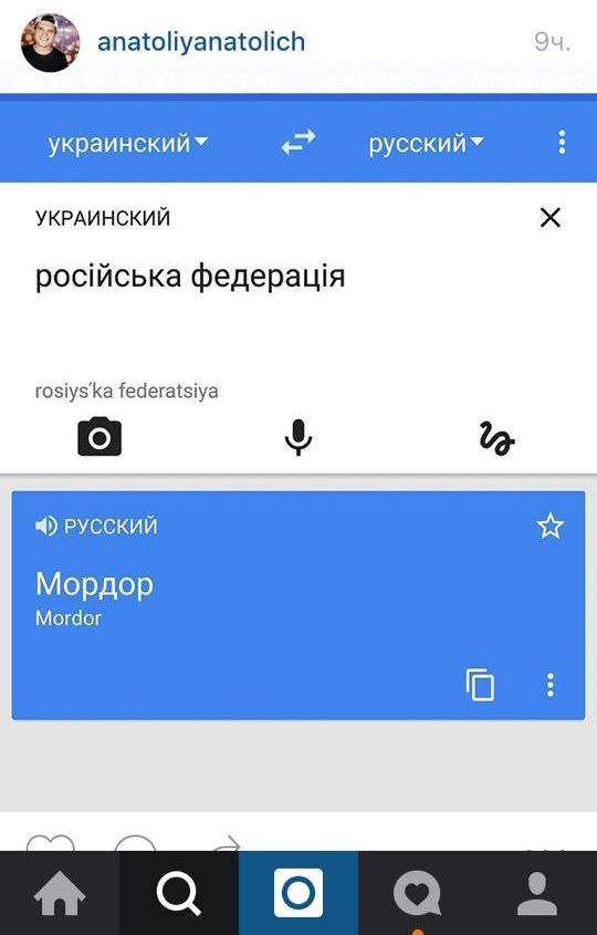 Сервис Google Translate начал переводить украинское словосочетание "Российская Федерация" на русский как "Мордор". Об этом сообщил ведущий "Сніданку" Анатолий Анатолич на странице в соцсети Instagram.