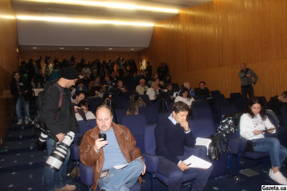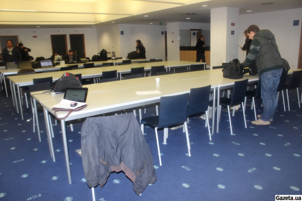 Зал для пресс-конференций напоминает небольшой зал в кинотеатре.