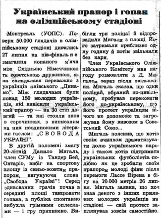 "Монреаль (УОПС). Поверх 50.000 глядачів в олімпійському стадіоні дивились 27 липня на півфінальне змагання копаного м'яча між Східньою Німеччиною та совєтською дружиною, яка складалася переважно з українців київського ,Динамо". Між глядачами були понад 150 молодих українців, які вивісили український прапор — на 30 стіп довгий — та які стояли знов у сорочинках, з виписаним на них поодинокими літерами гаслом: "СВОБОДА УКРАЇНІ". В другій половині змагу 20-літній Данило Мигаль, член СУМу із Тандер Бей, Онтаріо, вибіг на спортову площу із синьо-жовтим прапором. вигукуючи слова "Свобода Україні"! Серед здивованих грачів почав в середині площі танцювати гопака, а публіка спонтанно вибухла грімкими оплесками — і гру припинено. Вибігли три поліцаї й відпровадили Мигаля з площі.