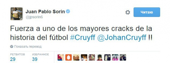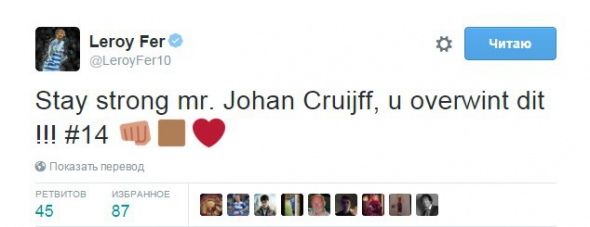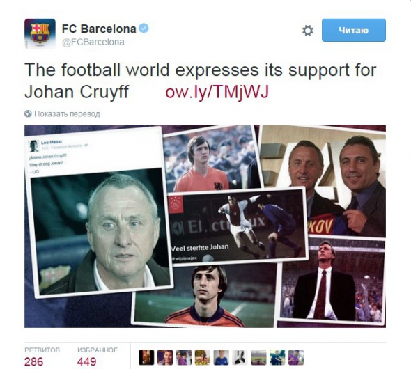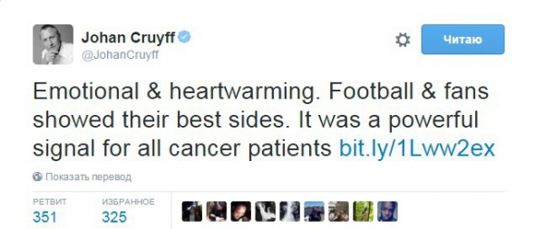 В колонке в "De Telegraaf" Йохан написал, что благодарен всем, кто поддерживает его сейчас. В твиттере Кройффа тоже появилось обращение: "Эмоционально и трогательно. Люди из футбола и болельщики показали себя с наилучшей стороны. Это был сильный импульс для всех, кто болен раком".