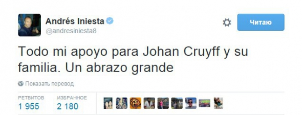 Андрес Иньеста: "Моя поддержка – Йохану Кройффу и его семье. Крепко обнимаю".