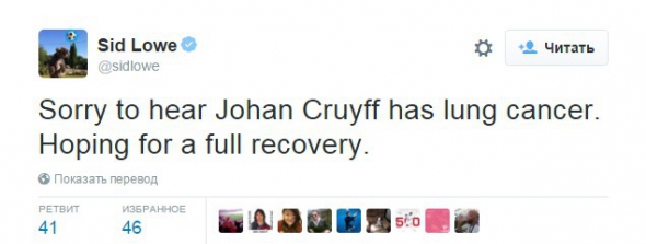 Сид Лоу, журналист: "Жаль узнавать, что у Йохана Кройффа рак легких. Надеюсь, он полностью выздоровеет".