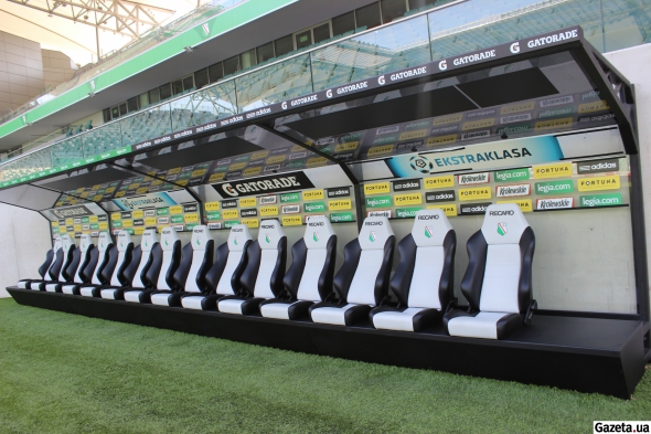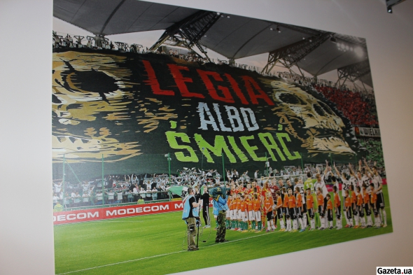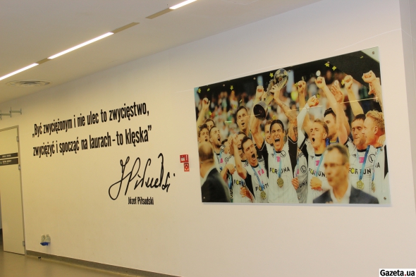 Коридоры стадиона завешаны красивыми фото и даже цитатой маршала Юзефа Пилсудского чьим именем и названа арена