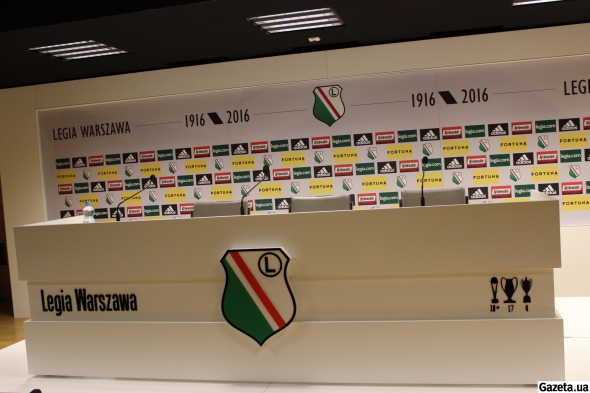Зал для пресс-конференций. Вчера здесь с прессой общались наставник "Легии" Хеннинг Берг и тренер "Зари" Юрий Вернидуб