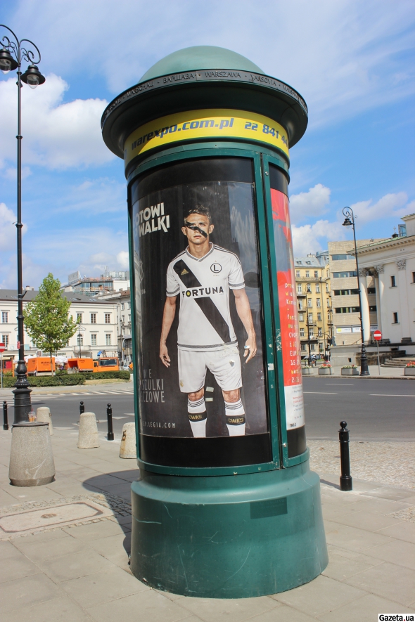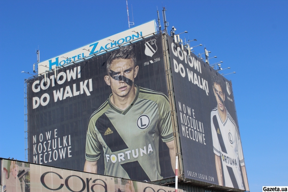 Капитан варшавской "Легии" Якуб Жезничак призывает фанатов купить новую футболку команды. Постеры защитника можно увидеть по всему городу. А вот реклама матча с "Зарей" отсутствует.