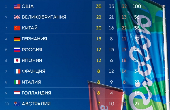 В медальном зачете Украина занимает теперь 23-е место, имея в активе 8 медалей, - 2 золотые, 4 серебряные и 2 бронзовые. Десятка лидеров в зачете выглядит так: