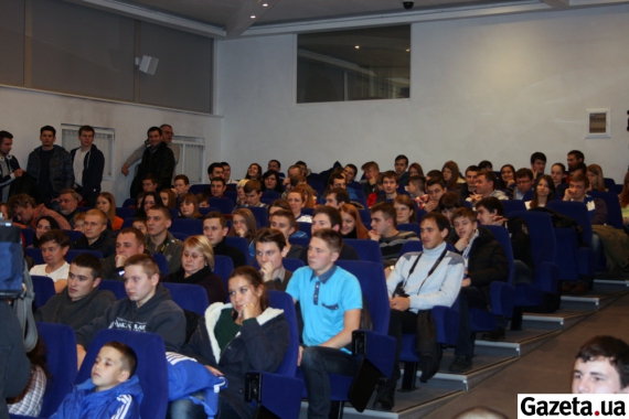 В зале аншлаг. Сидят болельщики, в основном молодые люди, есть и дети школьного возраста. Почти у всех – динамовская атрибутика. На столе – стопка клубных журналов с фотографией Реброва на обложке, мяч с автографами, пару фломастеров, бутылка минералки. В ожидании тренера, который застрял в пробках, присутствующие под руководством ведущего мероприятия, спортивного журналиста Александра Липенко репетируют строчку из фанатской считалки "наш герой – Сергей Ребров".