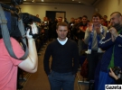 Тренера встречают стоя, аплодисментами под динамовскую музыку. Одет в серые штаны и темную ковту, из под нее виднеется белая футболка. Вид усталый, только под утро вместе с командой и делегацией прилетел в Борисполь.