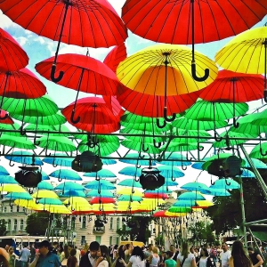 На Софийской площади перед сценой установили конструкции, которые удерживают над головами людей сотни цветных зонтиков. На сцене выступает группа "Конкорд" из шоу "Украина имеет талант".