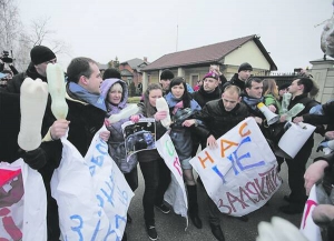 Около 9.45 из "Межигорья" выезжает кортеж. Пикетующие подходят к центральным воротам и трясут бутылками с горохом.