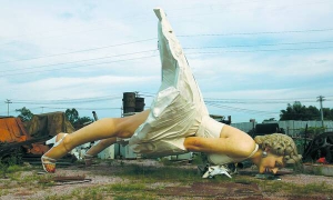 9-метровая статуя американской актрисы Мэрилин Монро лежит на свалке в округе Гуйган, Гуанси-Чжуаньского автономного района на востоке Китая. Изготовленная из нержавеющей стали Монро весит 8 т. Авторы - несколько китайских художников. Для работы выбрали известную сцену из кинофильма "Зуд седьмого года" режиссера Билли Вайлдера. Зрителям он запомнился кадром, где струя воздуха из вентиляционной системы в нью-йоркском метро задирает вверх белое платье девушки из рекламы зубной пасты, которую сыграла Монро. Почему выбросили стальную статую - неизвестно. До того она полгода простояла в тамошнем бизнес-центре.