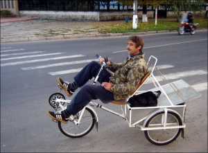 50-летний Виктор Буланенко из Лохвицы сконструировал трехколесный велосипед. Крутит педали лежа. Сзади велосипеда мужчина пристроил кузов. В нем перевозит овощи.