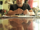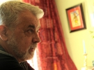 Господар запрошує присісти на диван за масивний дерев'яний стіл. Сам сідає навпроти на стільця із високою спинкою. Під час розмови крутить скріпку для паперу.
