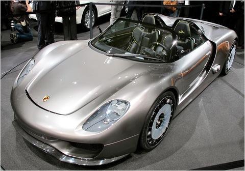 1. Porsche 918 Spyder - автомобіль має великі шанси вийти у серійне виробництво. Машина побудована на платформі гоночного Спайдера Porsche RS і оснащена гібридною силовою установкою, що поєднує в собі 500-сильний атмосферний двигун V8 об"ємом 3,4 літра, два електромотори сумарною потужністю 218 кінських сил і семиступінчастий "робот" з двома зчепленнями. Батареї силової установки можуть підзаряджатися від побутової електромережі. З нуля до "сотні" новинка здатна розігнатися за 3,2 секунди. Її максимальна швидкість складає 320 кілометрів на годину.