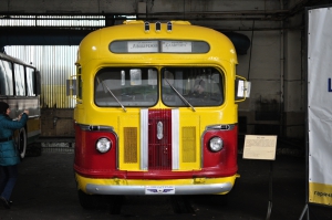 Один із найстаріших експонатів і добре відреставрованих – автобус ЗіС-155. Модель виробляли із 1949 по 1957 рік. Такі автобуси працювали у Києві 65 років тому. Це спрощена модель ЗіС-154. Після Другої Світової війни – це був єдиний масовий автобус Радянського Союзу. За 8 років виробництва таких випустили 21 тис.