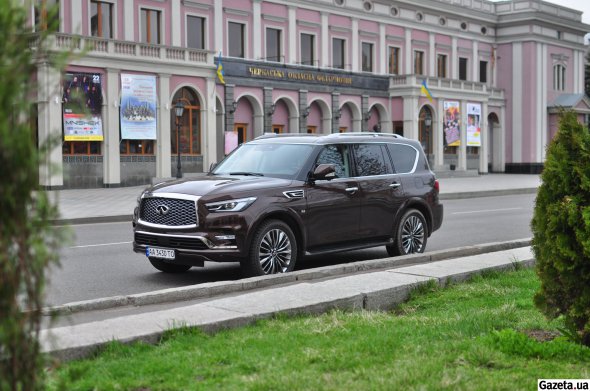 Infiniti QX80 одразу привертає увагу в підземному паркінгу японської компанії. Більшість машин біля позашляховика у половину нижчі й на третину коротші за нього. Машина коричневого кольору із переливом має невелику кількість хромованих деталей, сірі матові легкосплавні диски й реслінги на даху такого ж забарвлення.