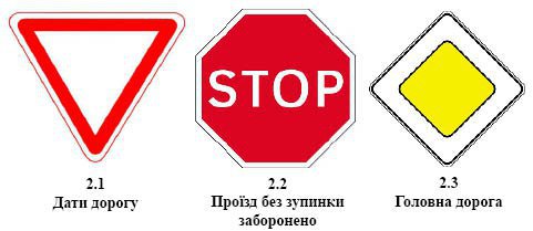 Знак 2.2 "Проїзд без зупинки заборонено". Він означає те саме, що і попередній, – дати дорогу транспорту, що рухається головною дорогою, яка перетинається.