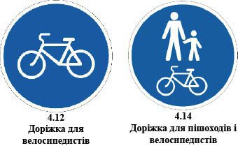 Знак 4.12 "Доріжка для велосипедистів". Позначає виділену доріжку, якою дозволяється рух лише на велосипедах. Однак якщо в даному місці немає тротуару або пішохідної доріжки, рух пішоходів велодоріжкою також дозволяється.