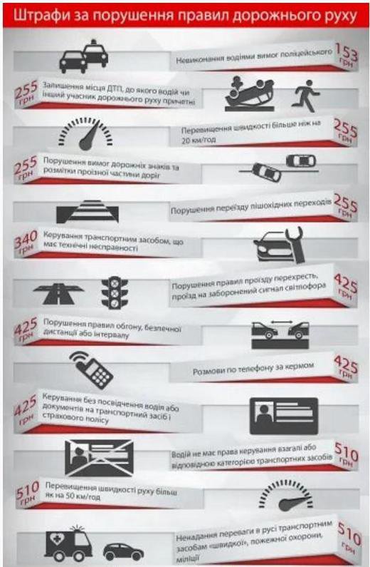 Під час порушення ПДР поліцейський складає протокол і виписує постанову про накладання штрафу. Його сплачують на користь районного Державного казначейства за місцем реєстрації водія. Штраф слід оплатити протягом 15 днів. В іншому випадку сума збільшиться удвічі. Неоплаченими штрафами займається Державна виконавча служба. Вона може накласти арешт на автомобіль.