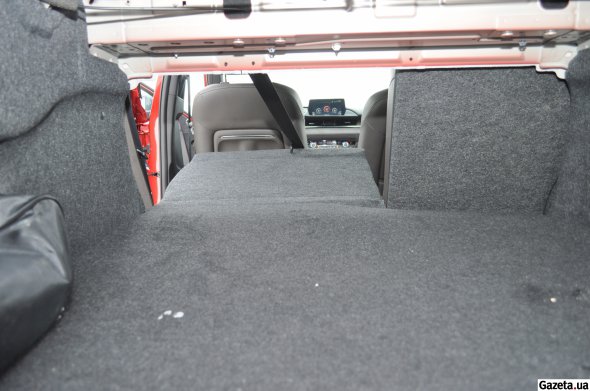 Петлі кришки багажника заховані під обшивкою, щоб не заважали багажу. З обох боків — невеликі пластикові ніші для пляшок і банок.