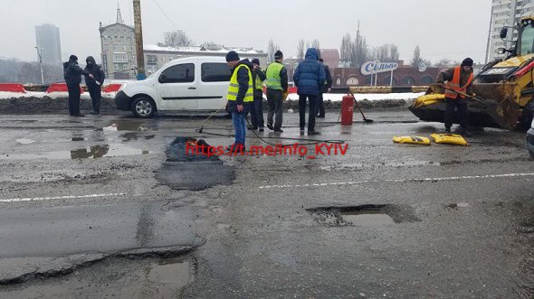 Ями на дорозі засипають лопатами просто із ковша екскаватора, пише Kyiv INFO у Facebook.