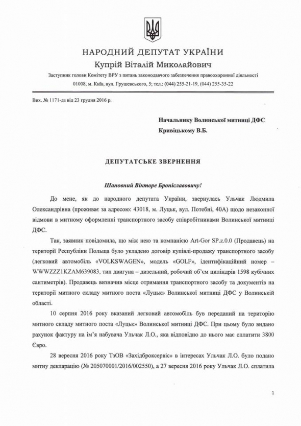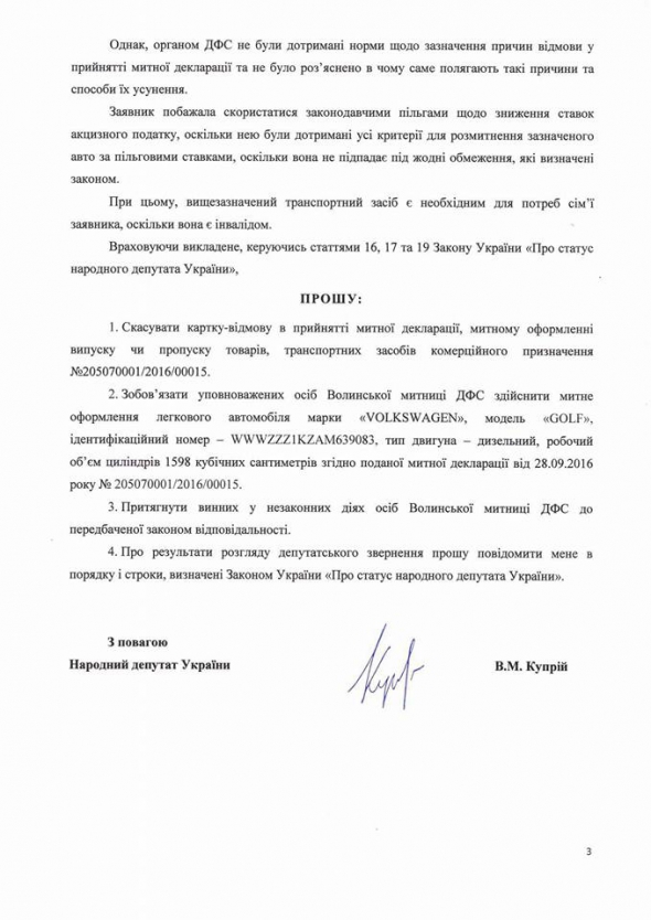 "Їхнє завдання - обдерти громадянина як липку, не дивлячись на його соціальний статус і матеріальне становище. Так, абсолютно з повітря, на Волинській митниці відмовляються розмитнювати вживані автомобілі. (...)Вимагаю у митників не створювати свавілля, діяти за законом і не заважати людям краще жити!" - написав Купрій на своїй сторінці у фейсбуці.