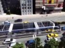 Новинка встановлена ??на спеціальній конструкції, яка має ширину транспортної смуги і дозволяє автомобілям проїжджати під салоном. Подібна інновація істотно знизить інтенсивність дорожнього руху у великих містах і може стати дешевшою альтернативою метро.