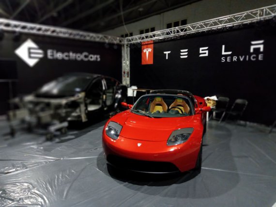 Червону Tesla Rоadster в Україні презентують вперше. Її на захід привезла компанія ElectroCars. Електромобіль привезли вчора о 00:00 на територію виставкового центру. Протягом 15 хвилин вивантажують з лафету й ставлять на стенд поряд із розібраною Model S і її вузлами.